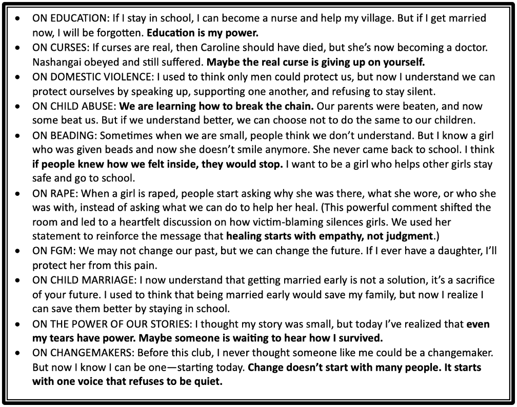 The curriculum is neutral–we share a few facts, but then it is discussion-based. Our leaders never say something is right or wrong, and all views are equally valued. We were curious to test the impact on beliefs and behaviors, so we chose the topic of Female Genital Mutilation (FGM) for an experiment. In the Samburu culture, no boy is supposed to marry a girl if she has not undergone FGM, so on the day clubs discussed FGM our leaders asked the boys if they would consider marrying a girl who had not been “circumcised” (FGM). In 2025, all our clubs were held in Maralal, a large town that is not so traditional, yet only 31% out of several hundred boys said they would consider it. In a rural area, this number would be far lower. At the end of the meeting, our leaders asked the same question again. After just this one meeting, 93% of the boys said they would consider marrying an uncircumcised girl. That is a big change in just one meeting!